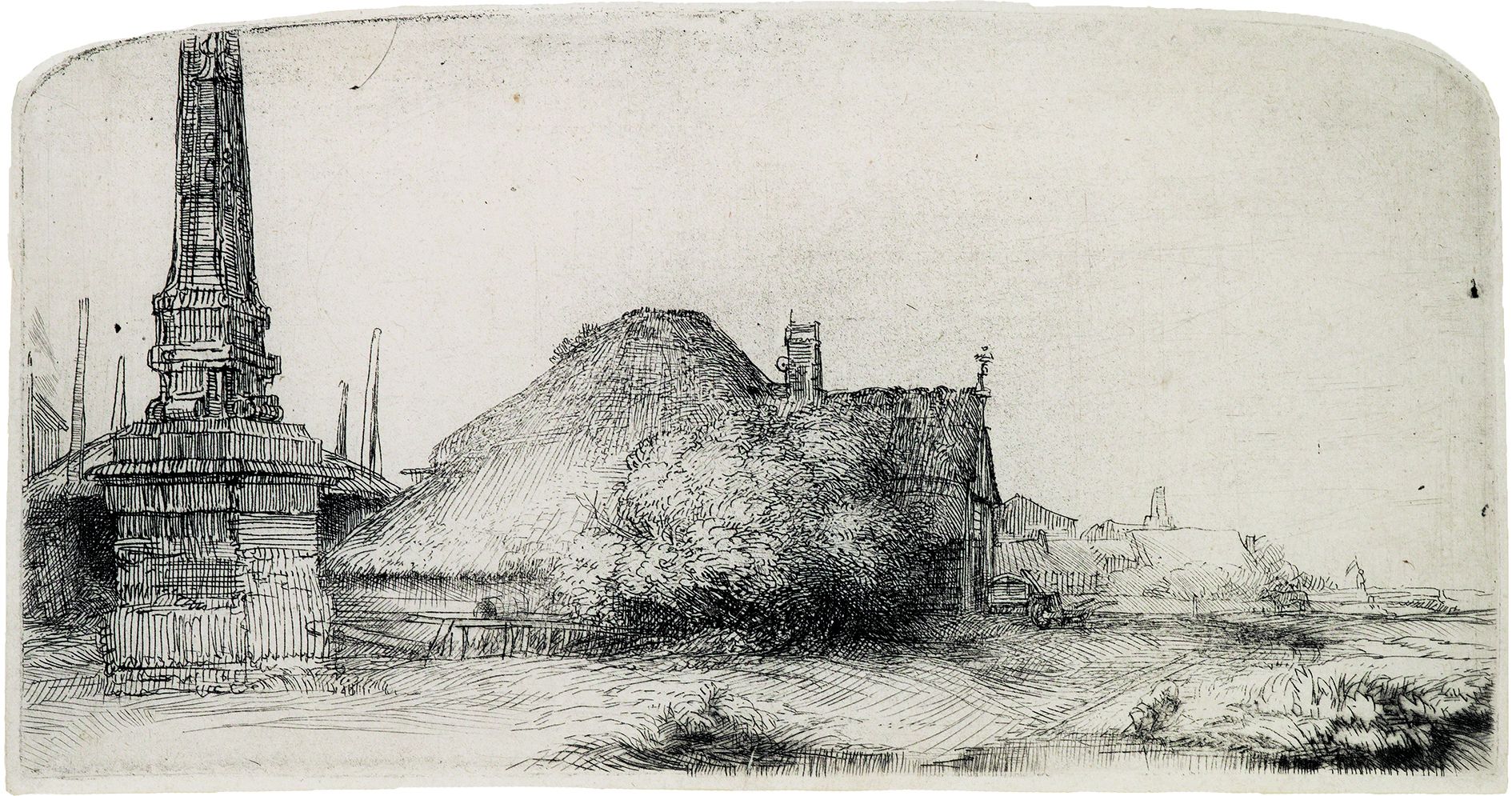 The print shows a boundary post (Mylpaal or Banpaal) just outside Amsterdam. There were six of these posts encircling the city and were meant to determine the area within which exiled citizens were not allowed to come. The one pictured here was identified by Frits Lugt in 1920 to be the one near Spieringshorn at the Spaarndammerdijk. The location is just somewhat east of Halfweg, a small village literally halfway between Amsterdam and Haarlem.